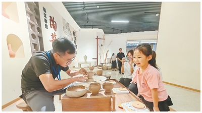 包茂高速广东茂名柏桥服务区开通运营后,吸引众多游客。图为在服务区内的非物质文化遗产展示馆,游客近距离观看非遗技艺。本报记者 贺林平摄